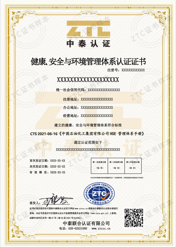 認證依據:(1)CTS HSSE-2018《HSSE管理體系要求》(中石化HSE適用)