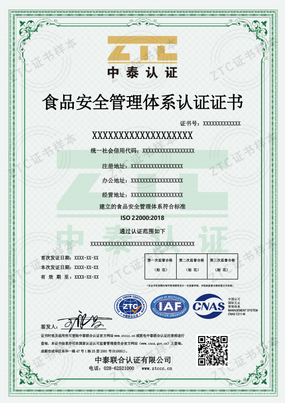 認證依據:ISO 22000:2018《食品安全管理體系食品鏈中各類組織的要求》