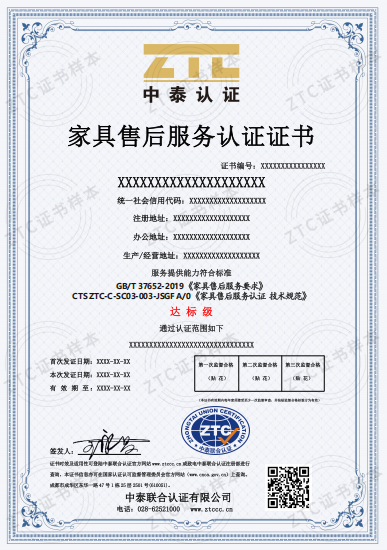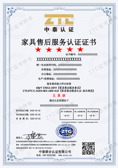 認(rèn)證標(biāo)準(zhǔn):GB/T 37652-2019《家具售后服務(wù)要求》和CTS ZTC-C-SC03-003-JSGF A/0《家具售后服務(wù)認(rèn)證 技術(shù)規(guī)范》