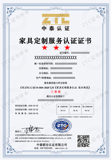 認(rèn)證標(biāo)準(zhǔn):CTS ZTC-C-SC14-004-JSGF C/0《家具定制服務(wù)認(rèn)證 技術(shù)規(guī)范》