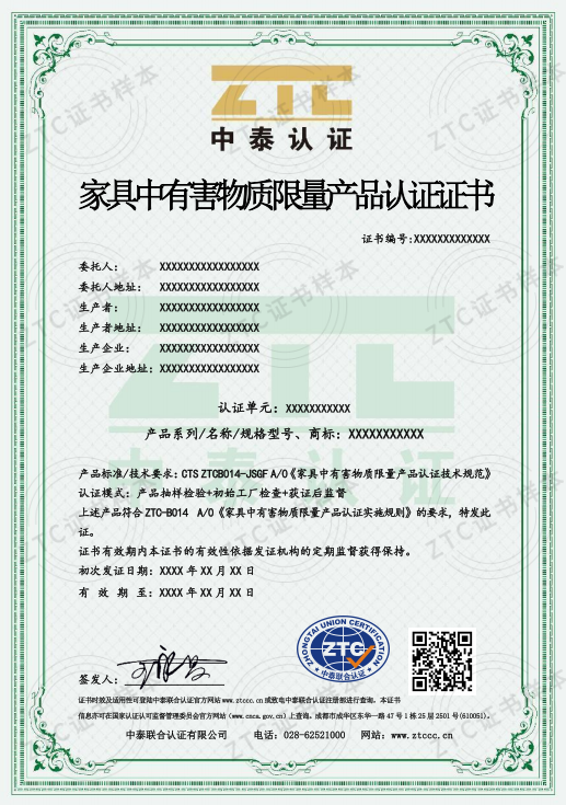 認(rèn)證標(biāo)準(zhǔn):CTS ZTCB014-JSGF A/0《家具中有害物質(zhì)限量產(chǎn)品認(rèn)證技術(shù)規(guī)范》