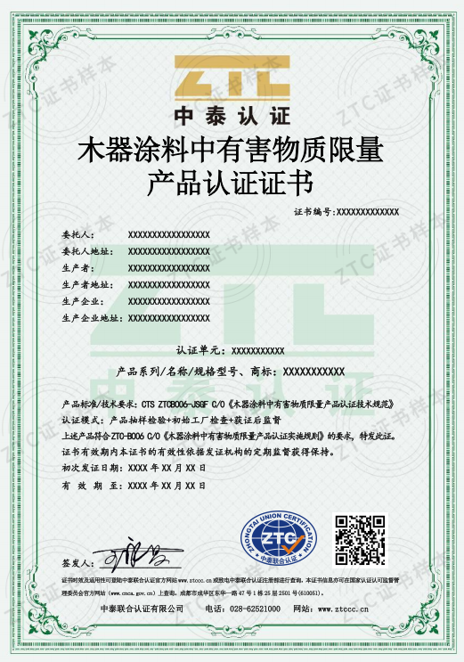 認證標準:CTS ZTCB006-JSGF C/0 《木器涂料中有害物質限量產品認證技術規范》