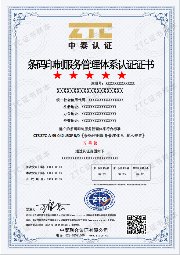 認(rèn)證標(biāo)準(zhǔn):CTS ZTC-A-99-042-JSGF C/0《條碼印制管理體系 技術(shù)規(guī)范》