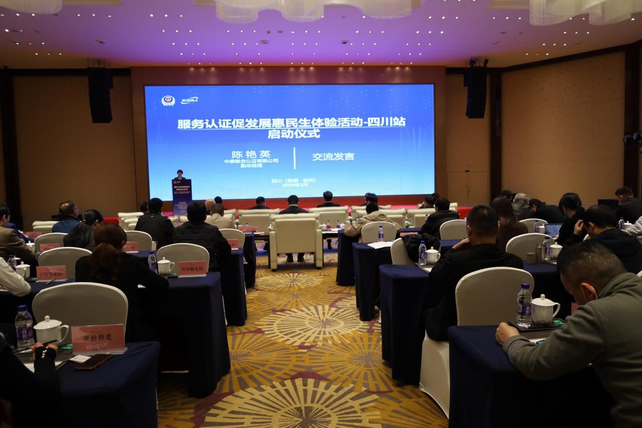本次啟動儀式中,中泰聯合認證有限公司副總經理陳艷英同志就“養老服務”和“惠民服務”發表了交流發言。她表示我司全面落實貫徹“惠民”的發展理念和服務宗旨,從2017年我司頒發的第一張“養老服務”認證證書開始,截止目前,我公司在“健康和社會工作”領域,為全國52家企業頒發了養老服務、醫療護理服務、殘疾人托養服務、殘疾人康復服務、護理陪護服務的認證證書共112張。覆蓋四川、湖北、湖南、上海、深圳等12個省市,其中養老服務認證企業33家,四川省內就有26家,占總數的78.8%。